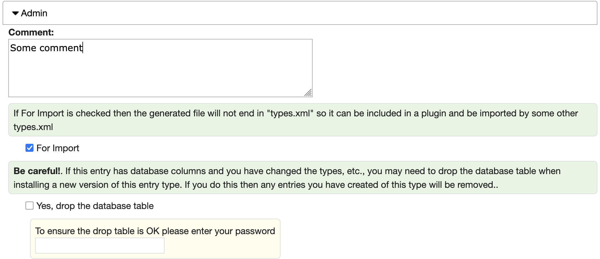 The Admin section allows you to specify a comment which gets included in the generated type.xml