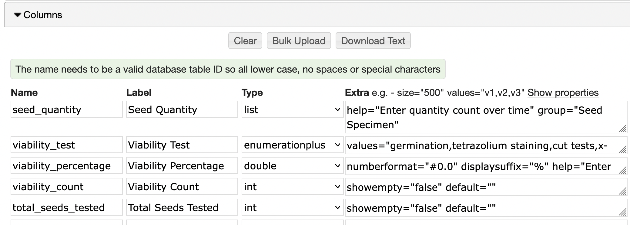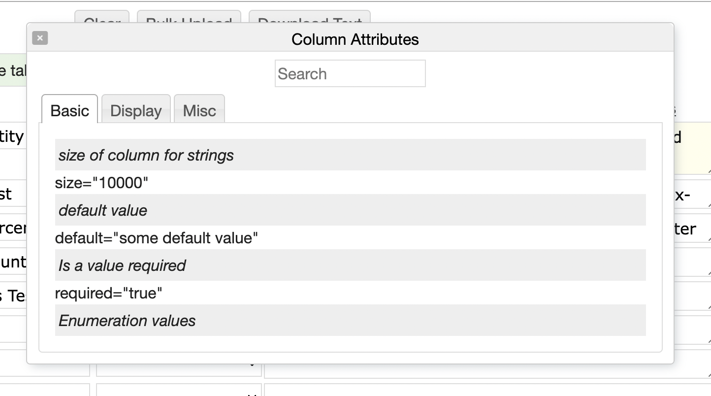 Each entry can have any number of column attributes. Each column (see in the example above) has a name, label, type, etc.