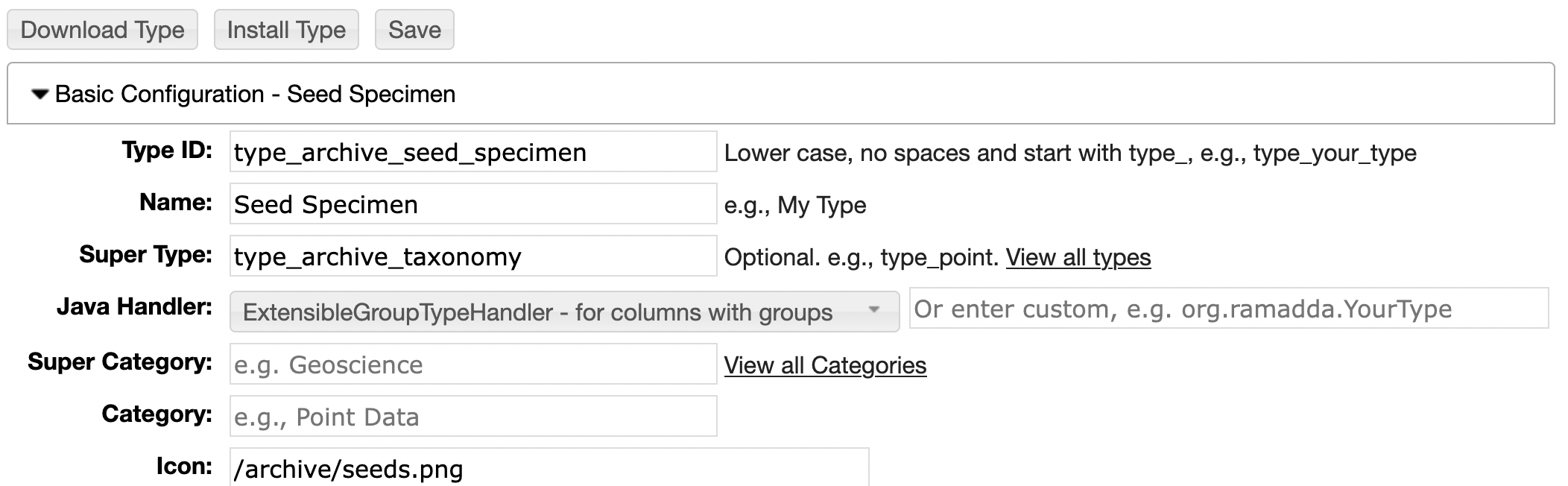 - You can specify an optional Super Category and Category. This is used to organize the big list of types.