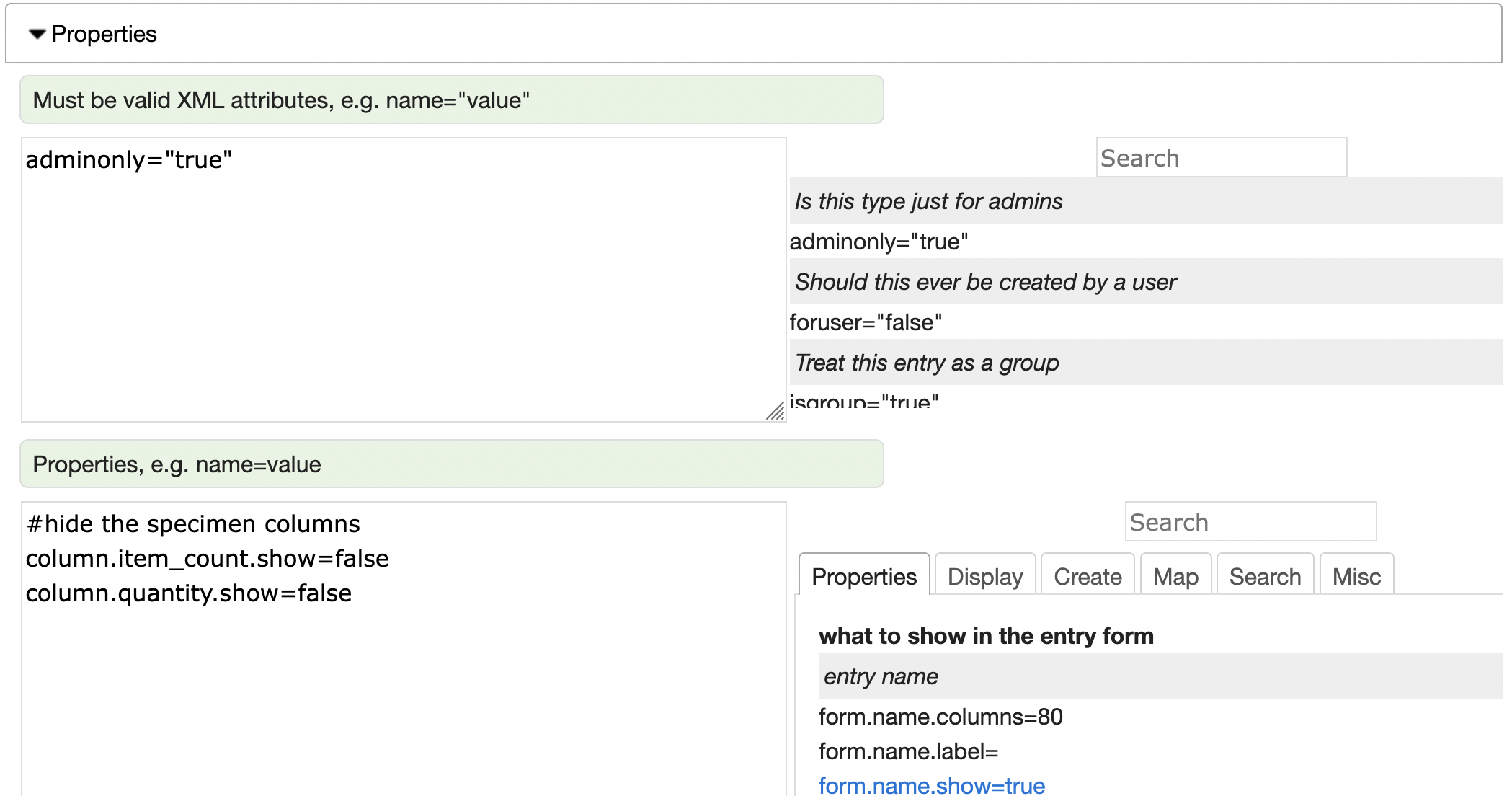 The Properties section provides a way to specify the myriad number of entry type properties.
