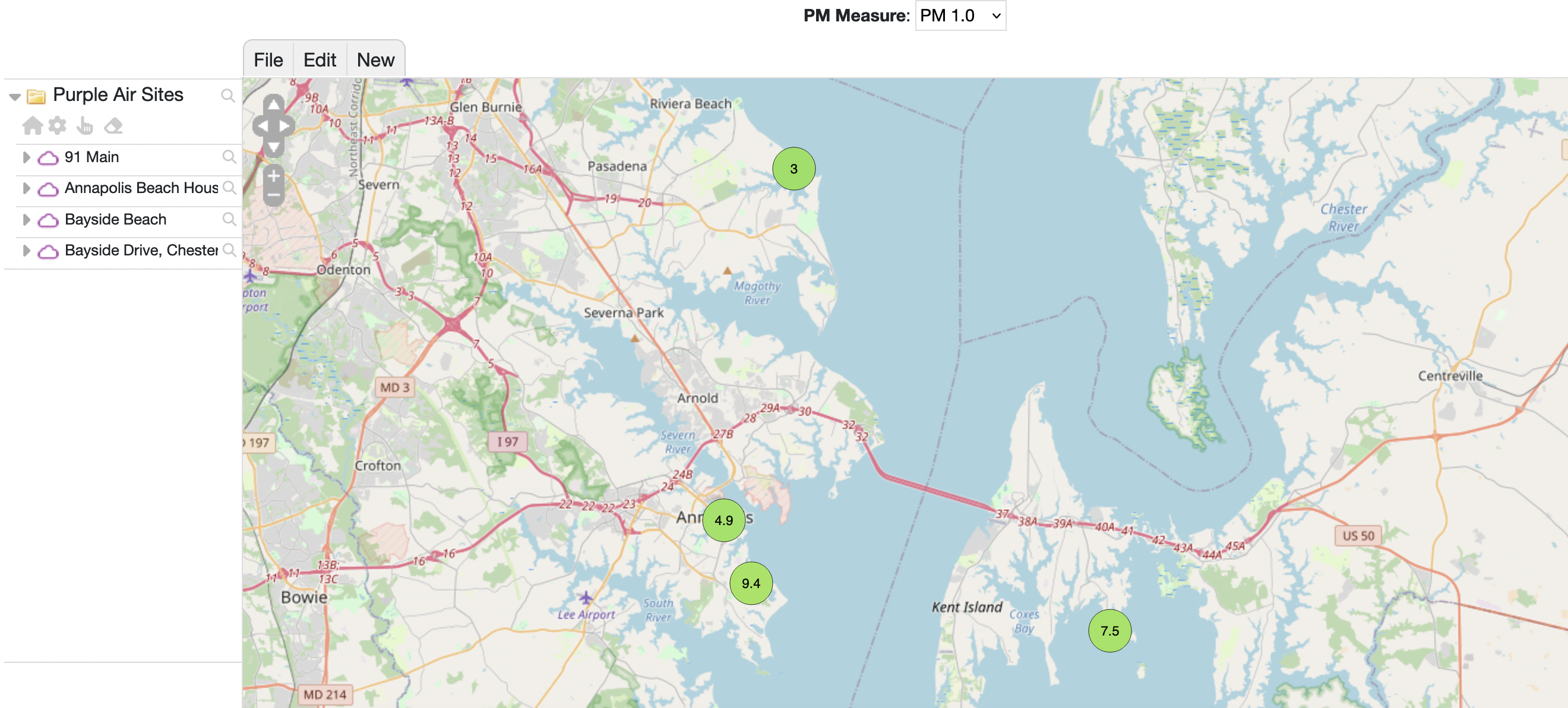 For example, the Purple Air sensors can show the PM2.5 measurements and a color coded circle.