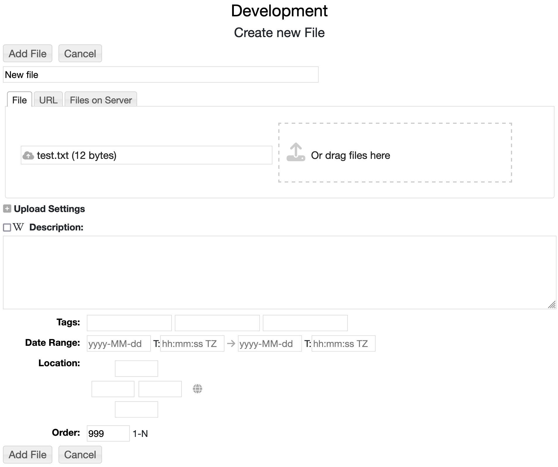 The Create Entry form allows you to upload a file or specify a URL.
