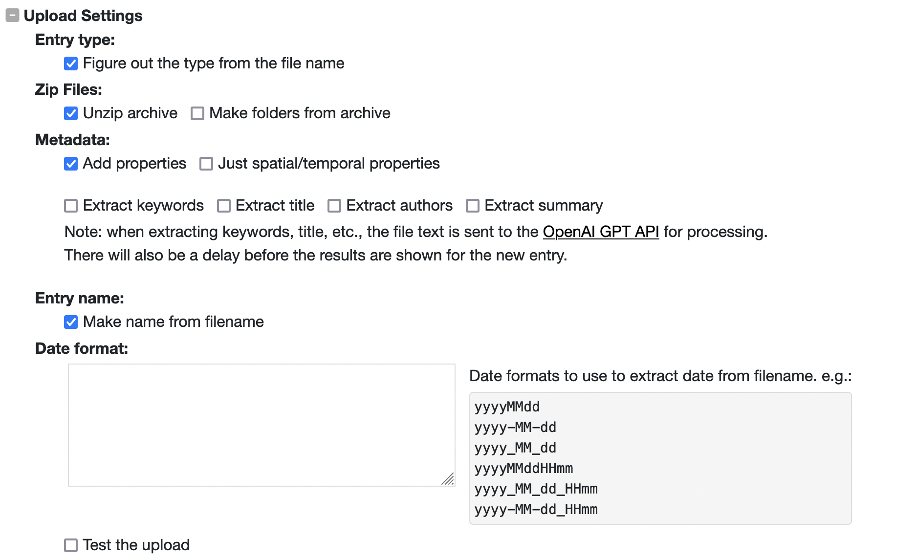 figure out the date of this entry. Clicking on "Test the upload" will show