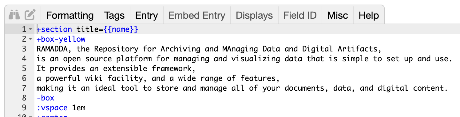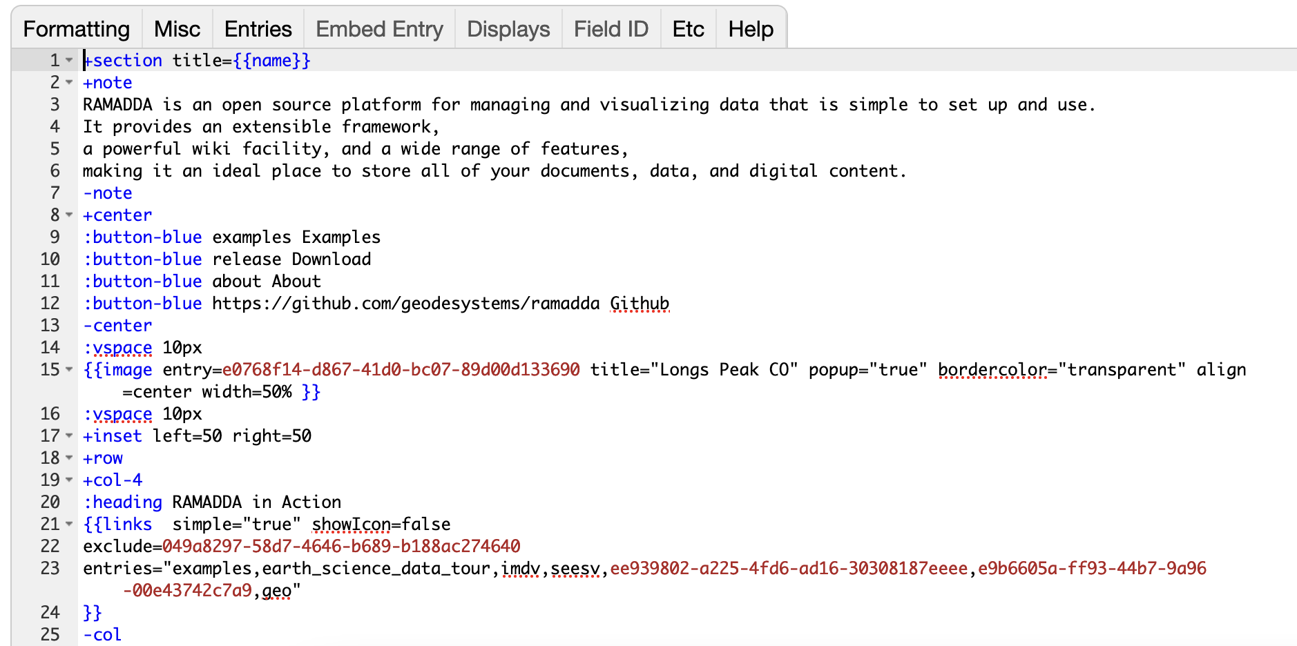 RAMADDA provides a wiki text editor for use with all of the above ways of using wiki text: