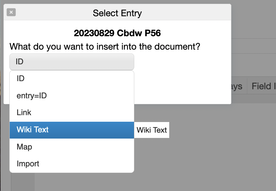 - Embed Entry - select an entry then specify how to embed it, e.g. Link, Tree, Gallery, or the entry specifier "entry=ID". For the "Wiki Text" embedding see below.